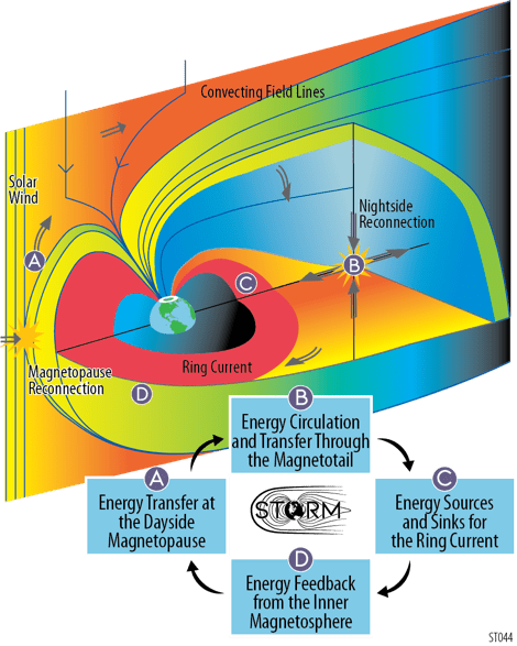 STORM comprehensively fills gaps in our current understanding of the solar wind-magnetosphere interaction by addressing the following science objectives: (A) energy transfer at the dayside magnetopause, (B) energy circulation and transfer through the magnetotail, (C) energy sources and sinks for the ring current, and (D) energy feedback from the inner magnetosphere. STORM is led by Principal Investigator Dr. David Sibeck and Deputy Principal Investigator Dr. Michael Collier at NASA’s Goddard Space Flight Center.