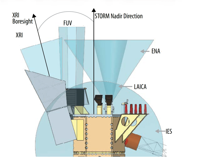STORM has a complement of 6 onboard instruments: 2 in-situ instruments and 4 imagers. STORM’s two in-situ instruments, the magnetometer (MAG) and ion electron spectrometer (IES), measure the local magnetic field and plasma, respectively. STORM’s 4 imagers, the soft x-ray imager (XRI), the far ultraviolet imager (FUV), the energetic neutral atom imager (ENA), and LAICA, make nearly continuous observations of the magnetopause and bow shock, the auroral oval, the Earth’s ring current, and the exosphere (respectively).